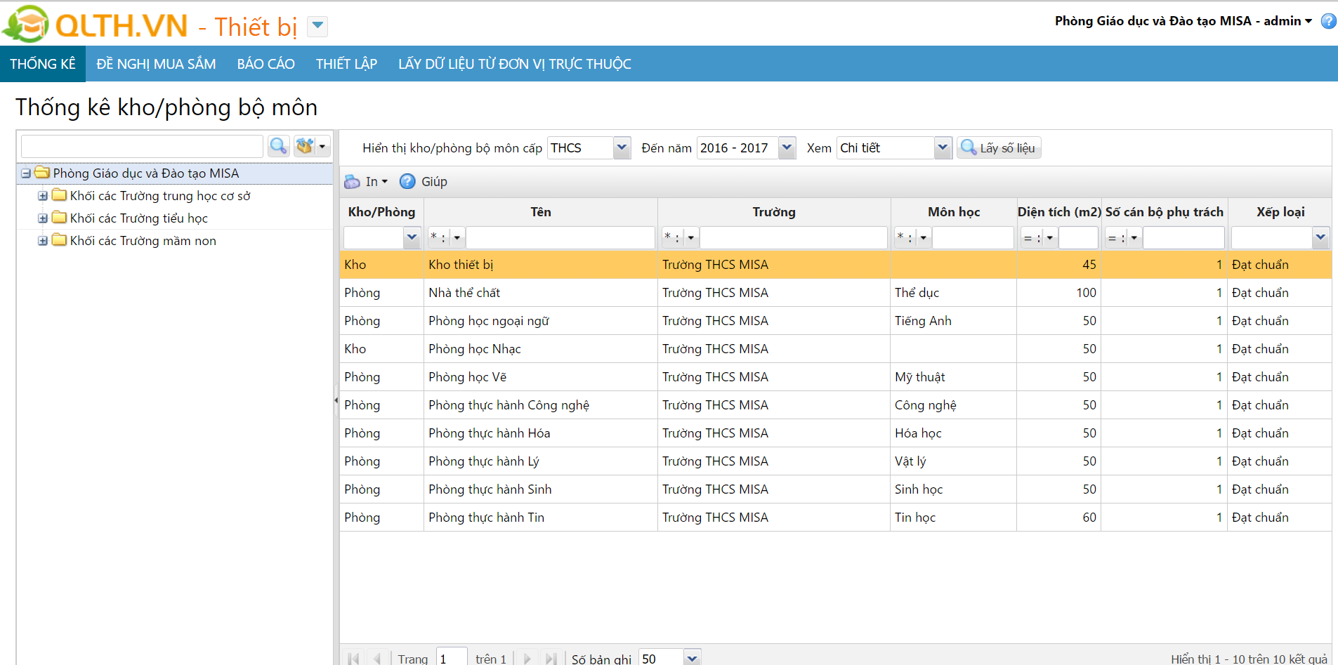 - Đăng nhập vào Phòng giáo dục hoặc Sở giáo dục, vào Menu Thiết bị\Thống kê chọn Tab Thống kê phòng bộ môn, Chọn xem chi tiết