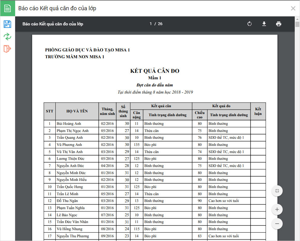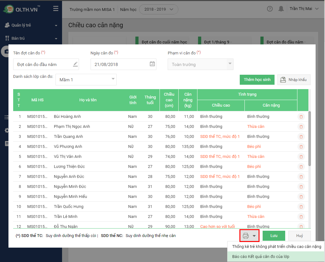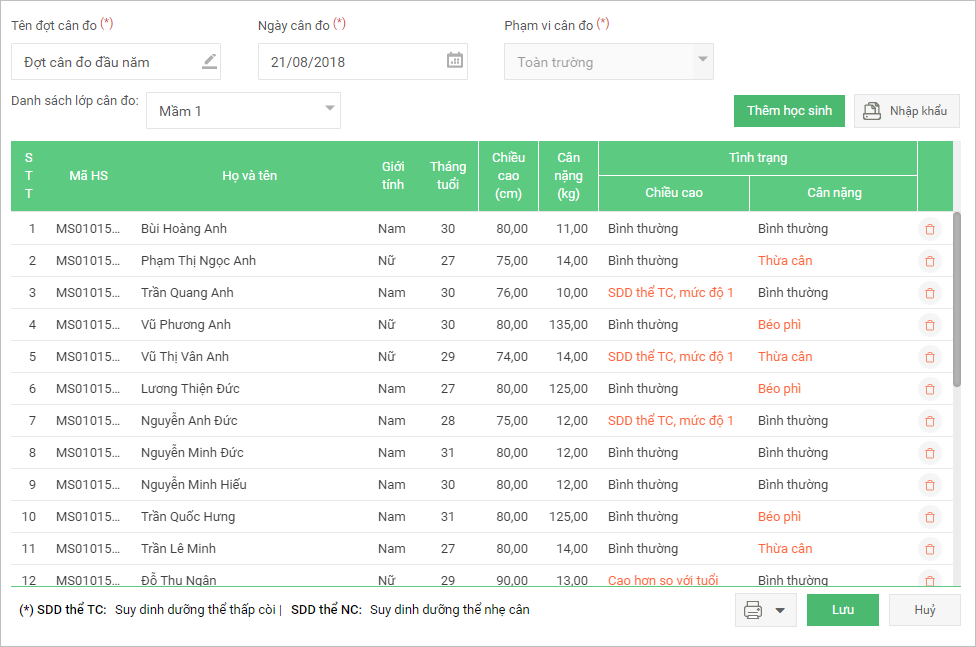 + Chọn Phạm vi danh sách học sinh cần thực hiện cân đo