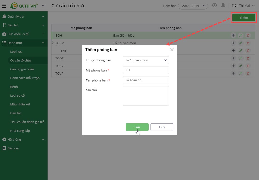 2. Nhấn Thêm và thực hiện khai báo thông tin phòng ban, tổ bộ môn.