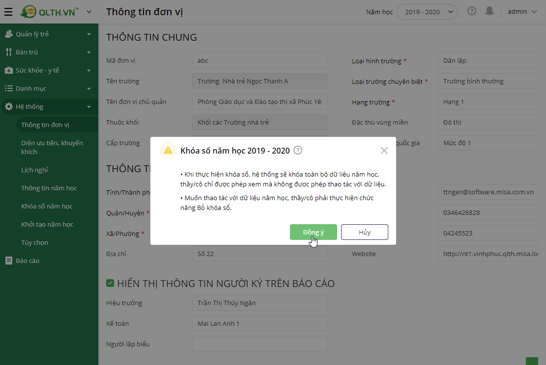 Đối với những đơn vị đã sử dụng phần mềm QLTH.VN đồng thời có các phát sinh trong năm học thì để có thể thực hiện khởi tạo năm học mới thì trước tiên đơn vị cần thực hiện Xét hoàn thành chương trình giáo dục mầm non cho các học sinh trong trường. Sau khi đã hoàn thành anh/chị thực hiện Khóa sổ năm học để chốt thông tin của học sinh trong năm học cũ.