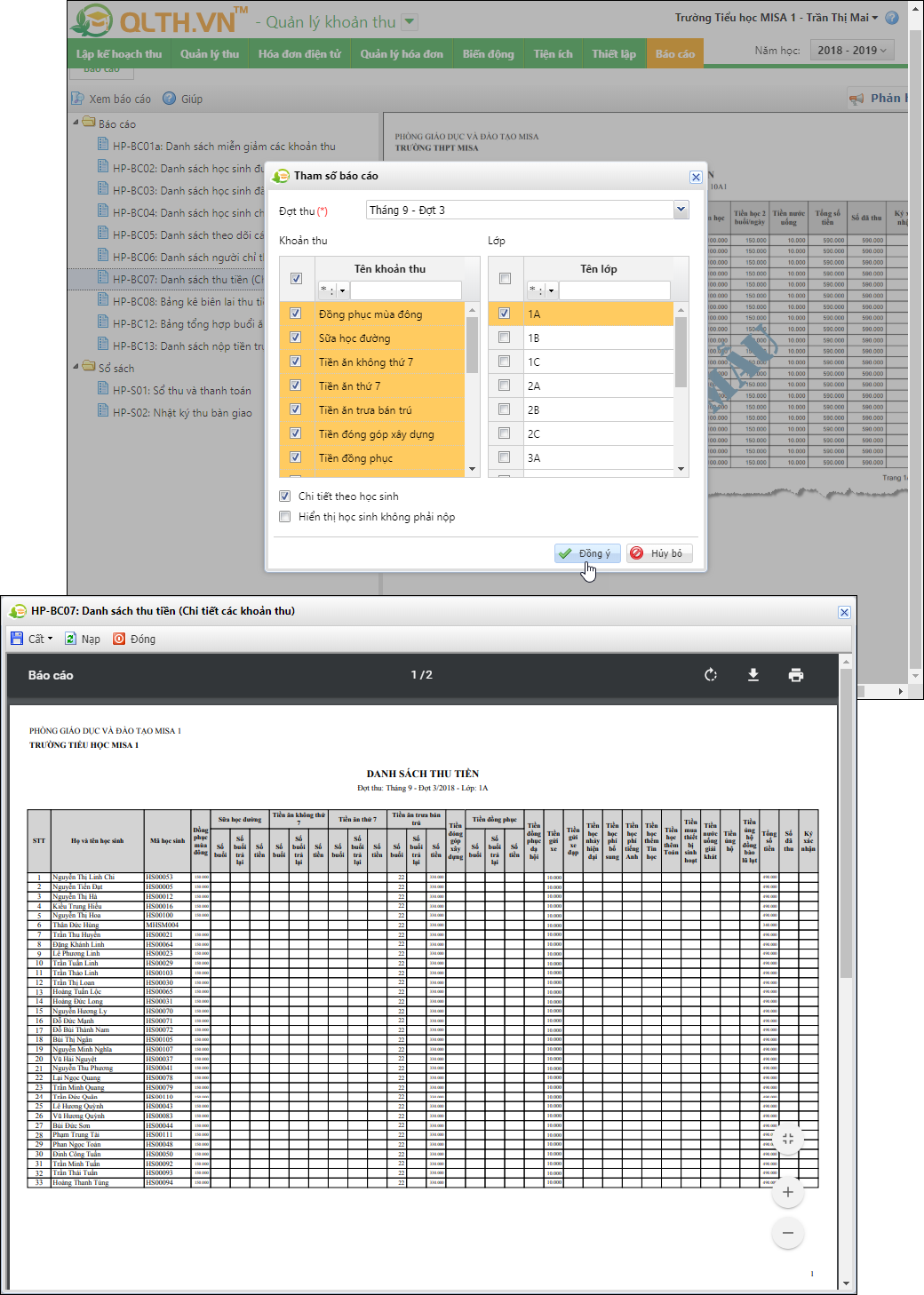 Chi tiết các bước hướng dẫn in báo cáo danh sách thu tiền (chi tiết các khoản thu) anh/chị theo dõi tại đây.