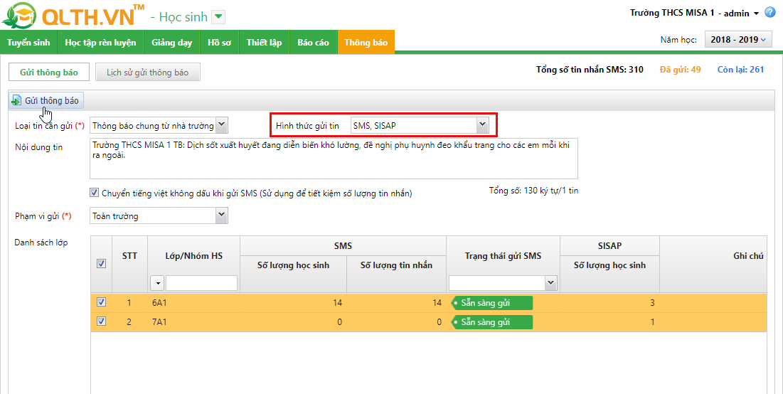 - Từ phiên bản R85.1, bổ sung tiện ích giúp nhà trường có thể thực hiện gửi thông báo chung theo từng trường hợp: chỉ sử dụng SMS, chỉ sử dụng SISAP hoặc sử dụng cả SMS và SISAP.