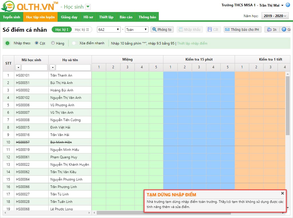 - Sau khi thiết lập tính năng tạm dừng nhập điểm, giáo viên vào màn hình sổ điểm cá nhân sẽ nhận được thông báo và không thể thực hiện nhập điểm cho học sinh.