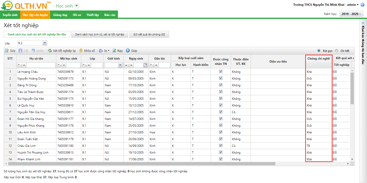 • Sau khi thực hiện Tổng hợp kết quả học tập cho học sinh khối 9 và thực hiện Cập nhật chứng chỉ nghề cho học sinh.