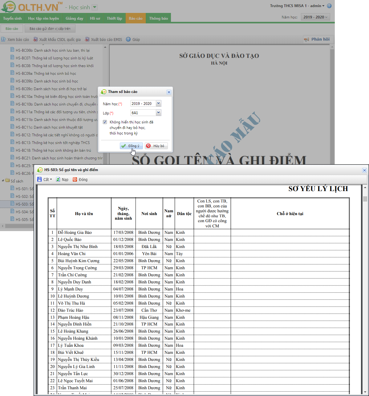 - Vào menu Báo cáo\HS-S03: Sổ gọi tên và ghi điểm.