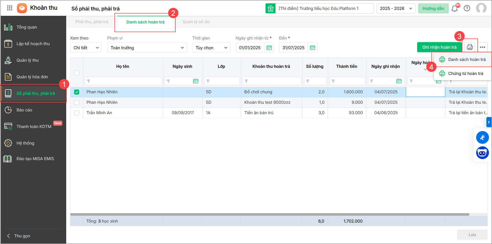 - Trong buổi họp phụ huynh, GVCN mời từng PHHS kiểm tra lại danh sách hoàn trả, bao gồm số lượng, số tiền và đợt thu đã ghi nhận, sau đó yêu cầu PHHS ký xác nhận. Cuối cùng, GVCN gửi lại danh sách đã ký cho kế toán lưu trữ.