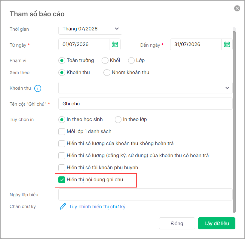 Khi in danh sách hoàn trả, đơn vị muốn hiển thị thêm phần ghi chú về đợt thu tiền đã hoàn trả nhằm đảm bảo minh bạch thông tin với phụ huynh.