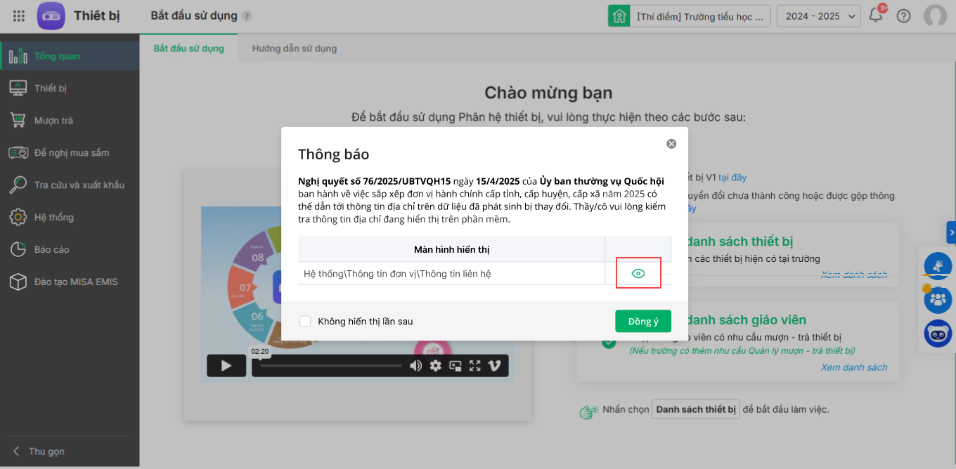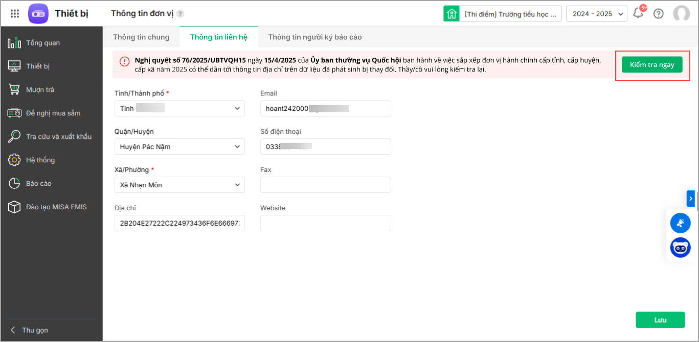 Lưu ý: Khi sửa địa chỉ đơn vị, thông tin địa chỉ sẽ được cập nhật đồng thời ở 4 phân hệ: Khoản thu, Thư viện, Học sinh và Thiết bị.