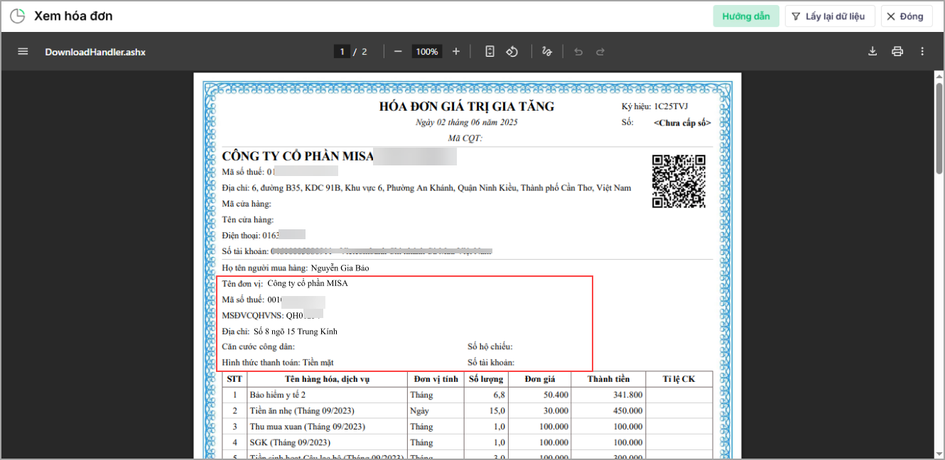 • Khi in hóa đơn, phần mềm sẽ hiển thị thông tin đơn vị công tác trên hóa đơn để phản ánh đúng đơn vị sử dụng dịch vụ. Học viên có thể sử dụng hóa đơn để nộp cho đơn vị công tác