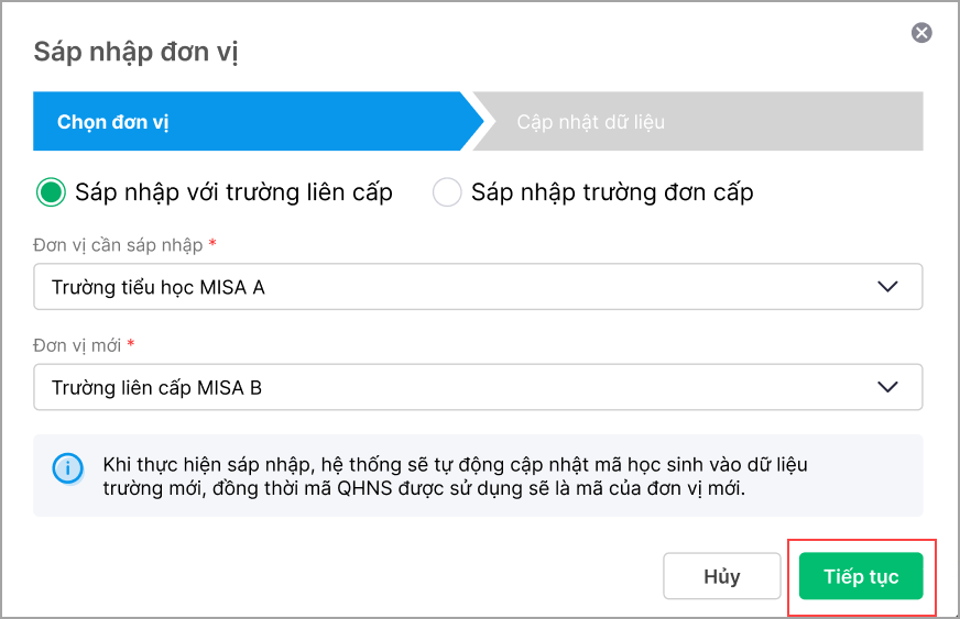 • Chọn đơn vị mới: Chọn đơn vị sẽ nhận sáp nhập dữ liệu. Đây sẽ là nơi lưu trữ dữ liệu học sinh, thiết bị,… sau khi sáp nhập xong.