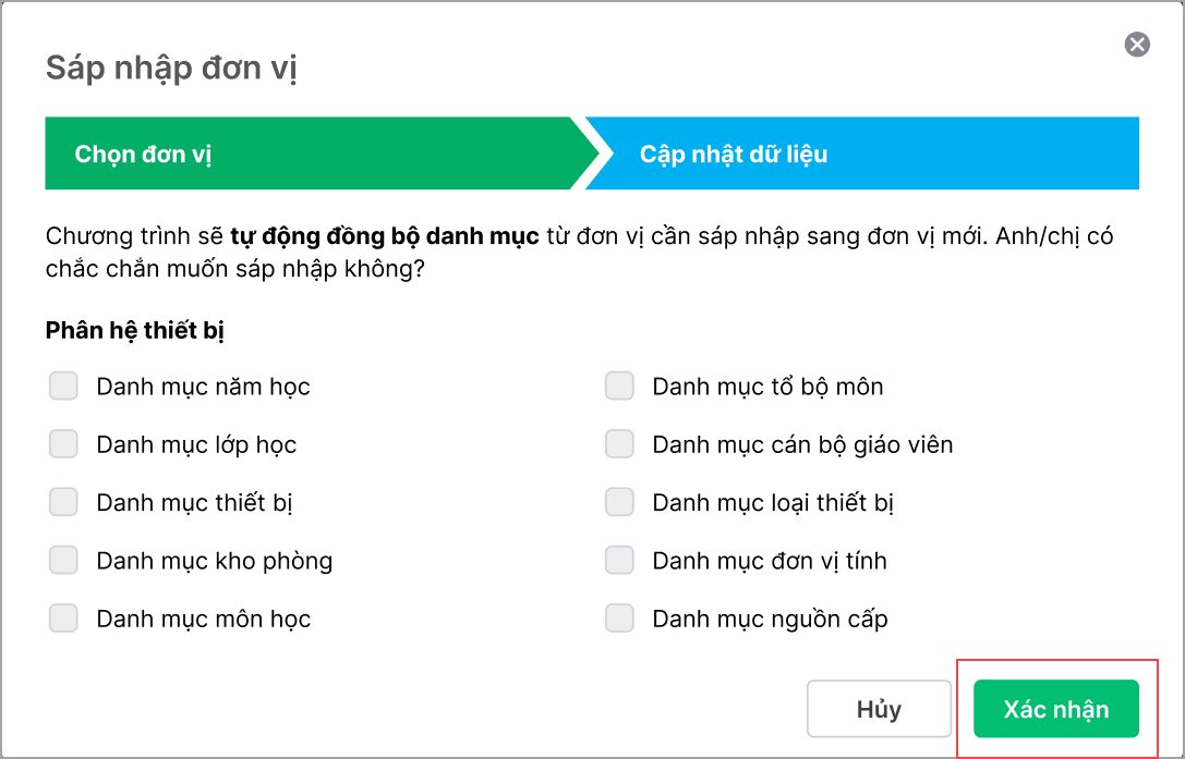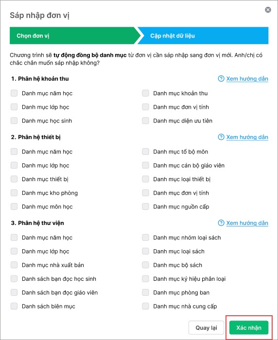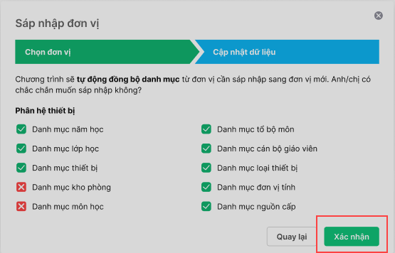 2. Phần mềm sẽ sao chép các danh mục đã chọn từ đơn vị cũ sang đơn vị mới. Chọn Xác nhận để tiến hành sáp nhập và đồng bộ dữ liệu theo danh mục đã chọn.