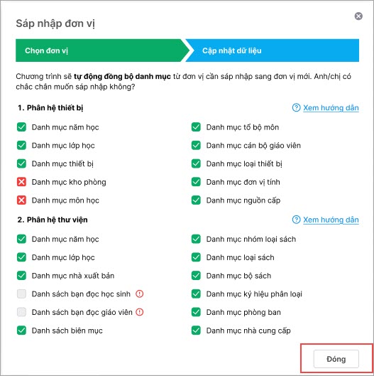 • Các danh mục có dấu (❌) là những danh mục không được đồng bộ, tức là dữ liệu tương ứng sẽ không được chuyển sang đơn vị mới.