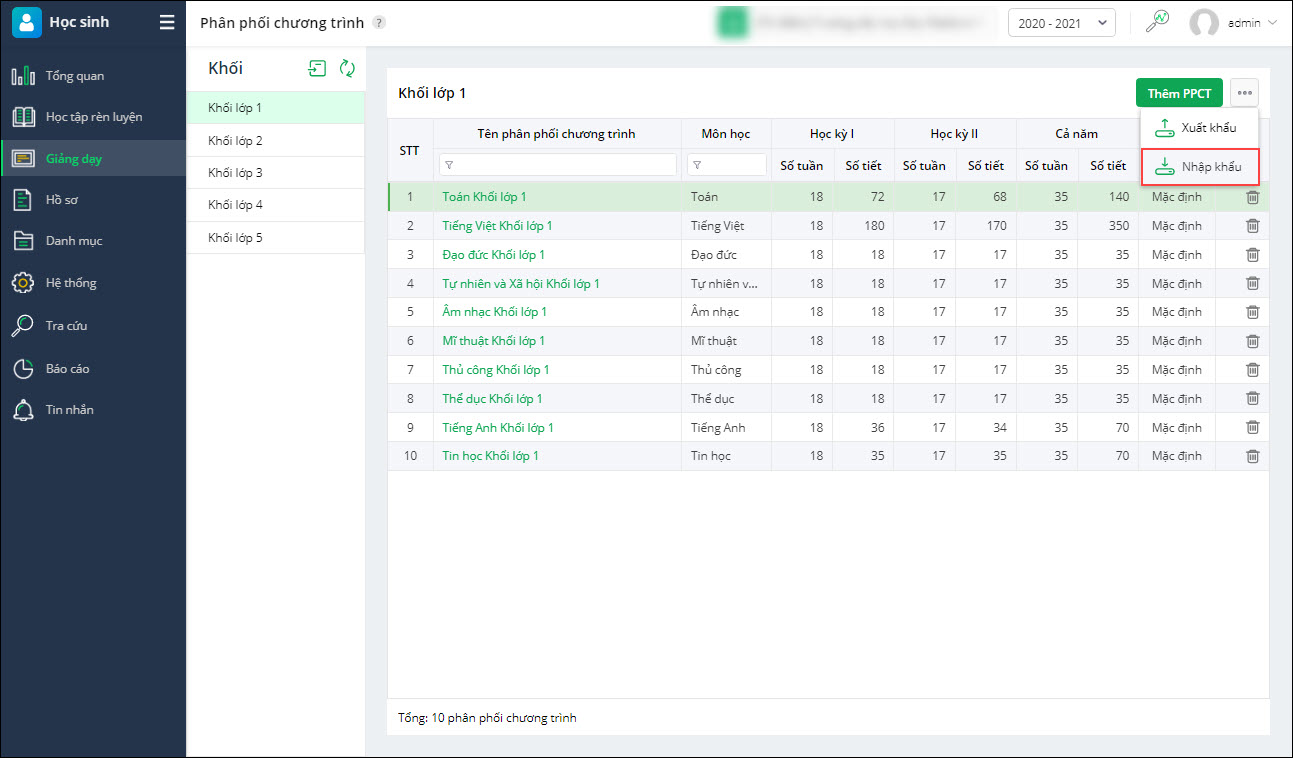 - Chọn khối lớp cần nhập khẩu phân phối chương trình.