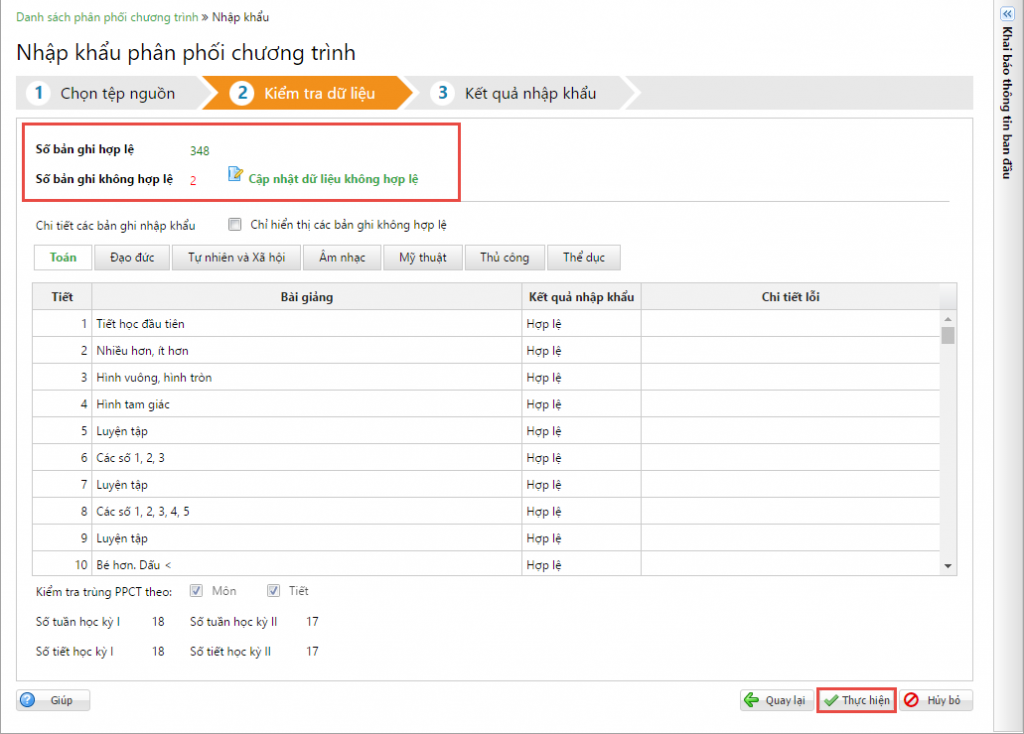- Nhấn Tiếp theo. Tại bước Kiểm tra dữ liệu, hệ thống sẽ chỉ ra bao nhiêu dữ liệu hợp lệ, bao nhiêu dữ liệu không hợp lệ.