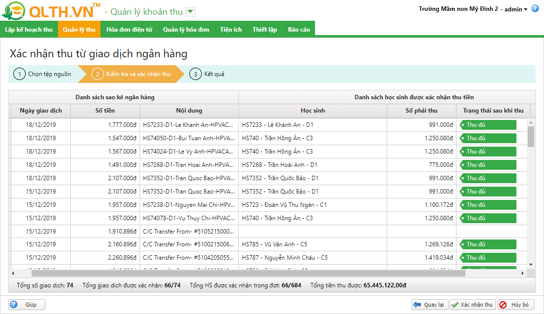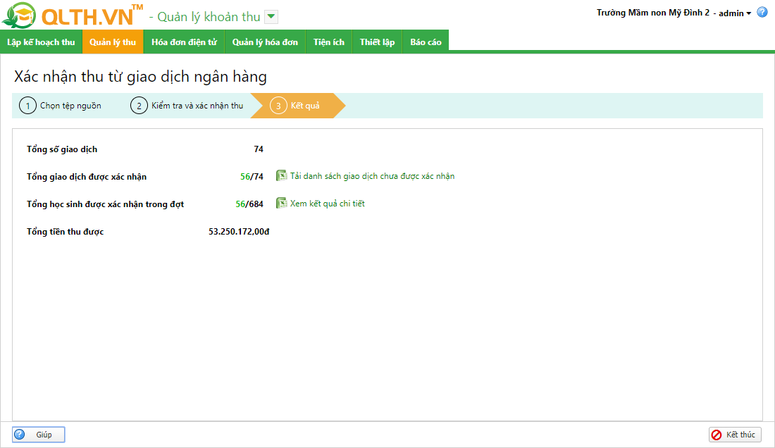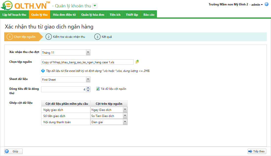 2. Khi phụ huynh thanh toán tiền học vào tài khoản của nhà trường tại Agribank, kế toán muốn nhanh chóng xác nhận khoản tiền nộp này trên QLTH – Khoản thu
