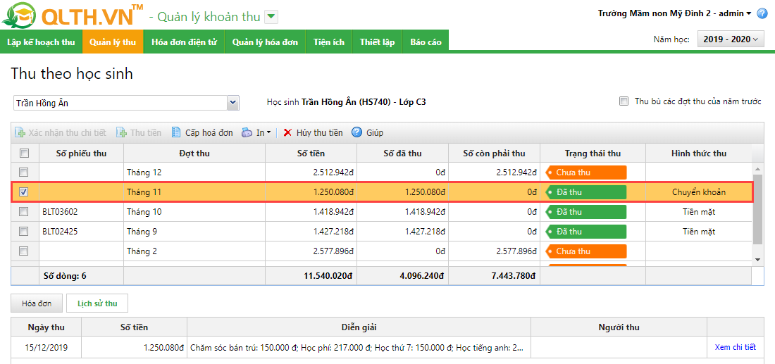 • Sau khi hoàn thành việc xác nhận thu từ giao dịch ngân hàng, kế toán vào menu Quản lý thu\Thu theo học sinh để kiểm tra kết quả xác nhận thu tiền. Với học sinh được xác nhận thành công sẽ có cột trạng thái thu là Chuyển khoản