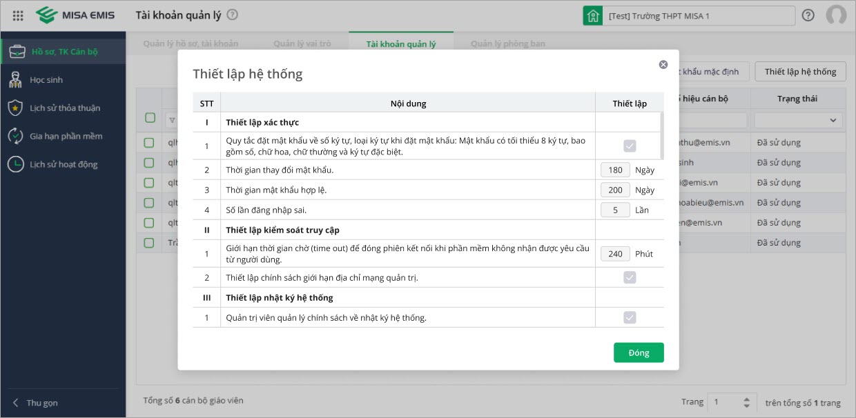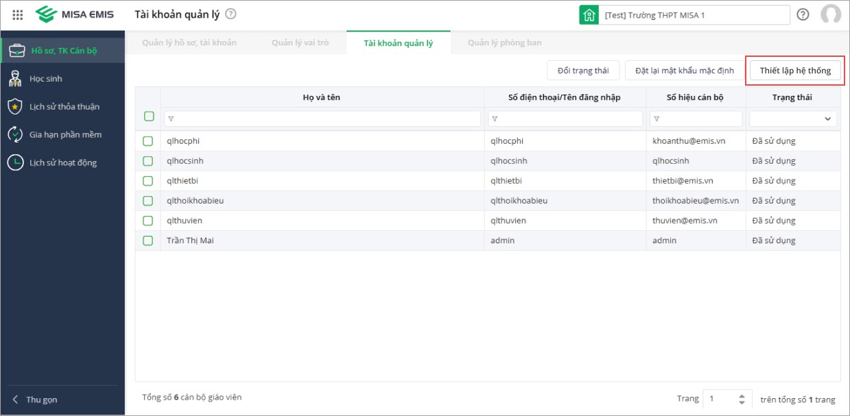 Tại menu Tài khoản cán bộ\Hồ sơ, TK cán bộ\Tài khoản quản lý: Phần mềm bổ sung tiện ích Thiết lập hệ thống