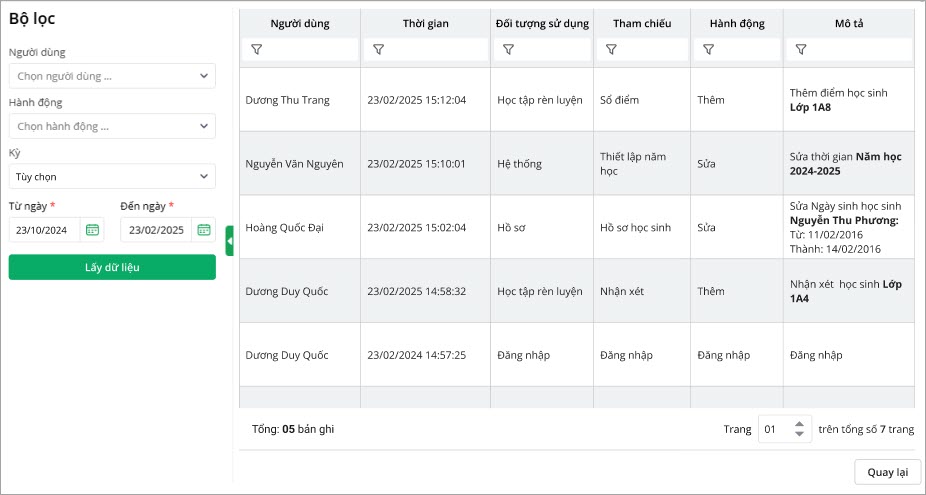 • Quản trị viên theo dõi và quản lý các hành động, sự kiện trên hệ thống qua nhật ký để nâng cao bảo mật và kiểm soát hoạt động.