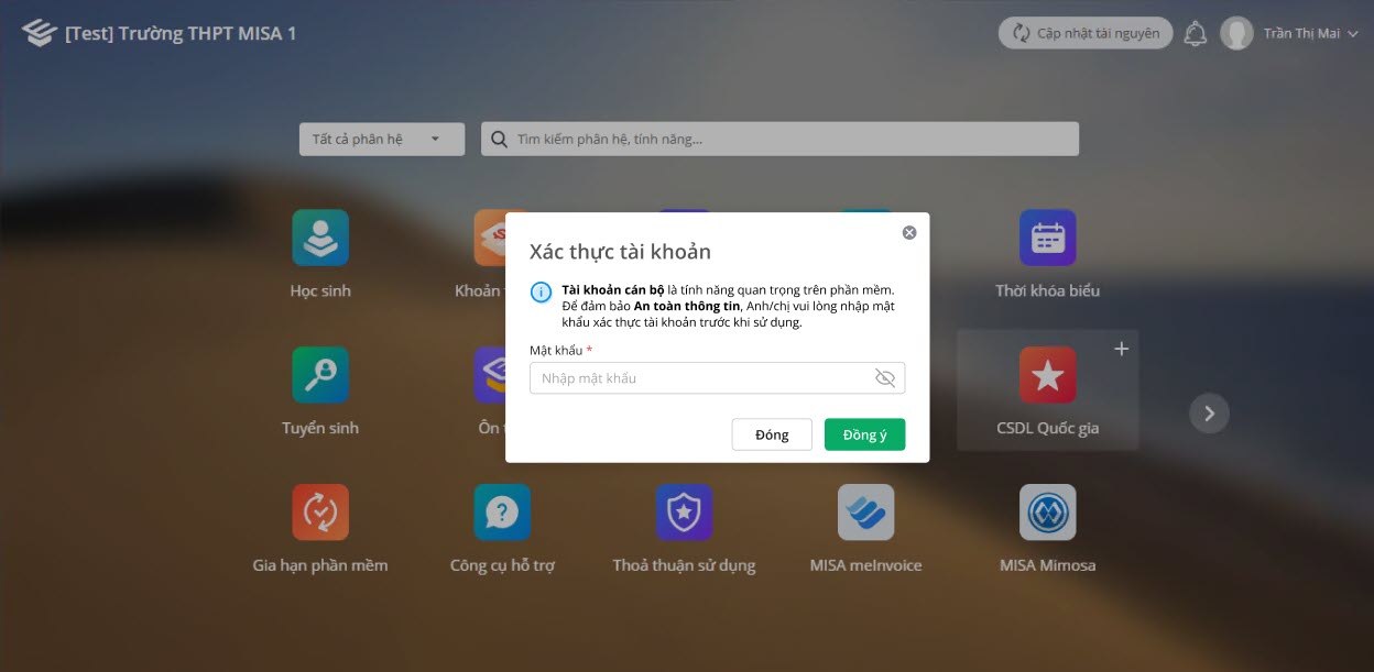 Khi đăng nhập phần mềm, hệ thống sẽ yêu cầu anh/chị xác thực người dùng. Anh/chị vui lòng nhập mật khẩu hiện tại của phần mềm để tiếp tục sử dụng.