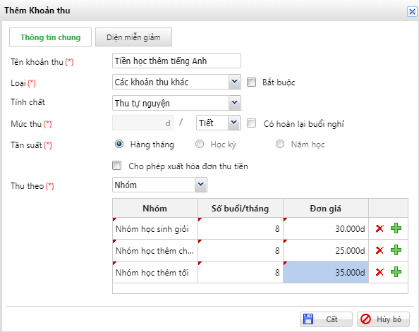 - Kế toán lập biểu thu có khoản là tiền học thêm Tiếng Anh với các nhóm khác nhau