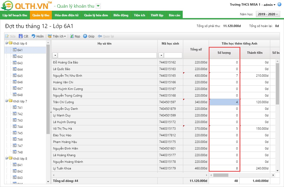 - Từ phiên bản R88, phần mềm bổ sung thêm cột thông tin số lượng tại màn hình chi tiết đợt thu giúp kế toán có thể theo dõi chi tiết số buổi học thêm tương ứng của từng học sinh