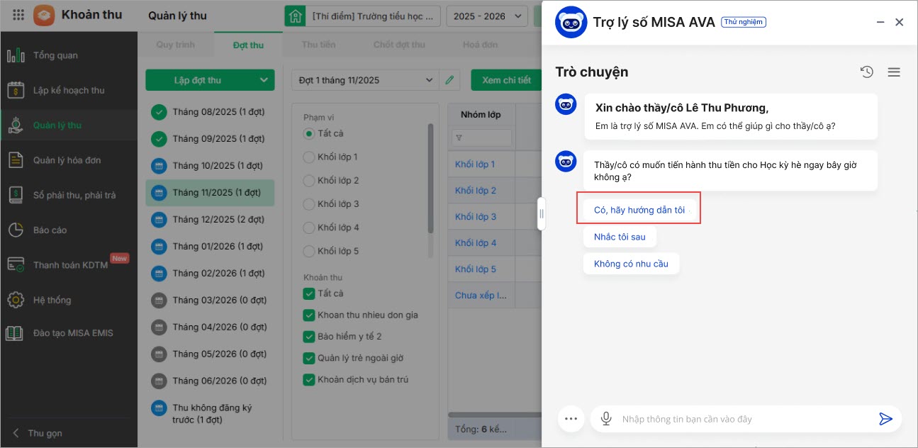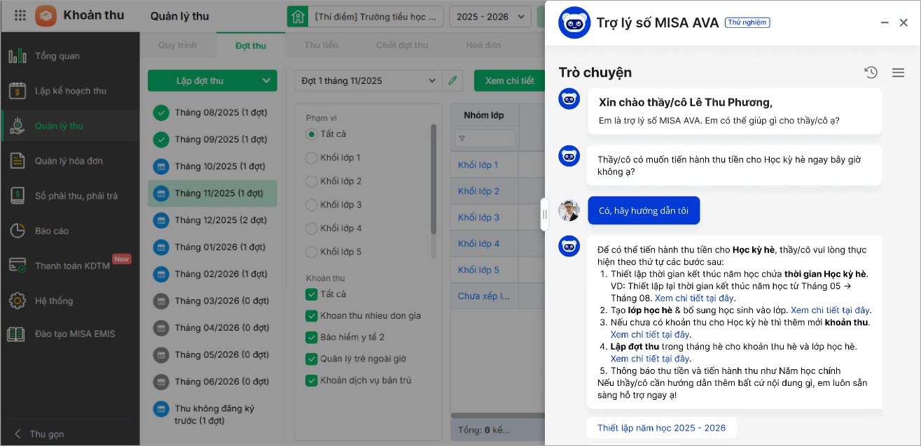 [MISA AVA] Hỗ trợ hướng dẫn khách hàng lập đợt thu và thu tiền cho học kỳ hè