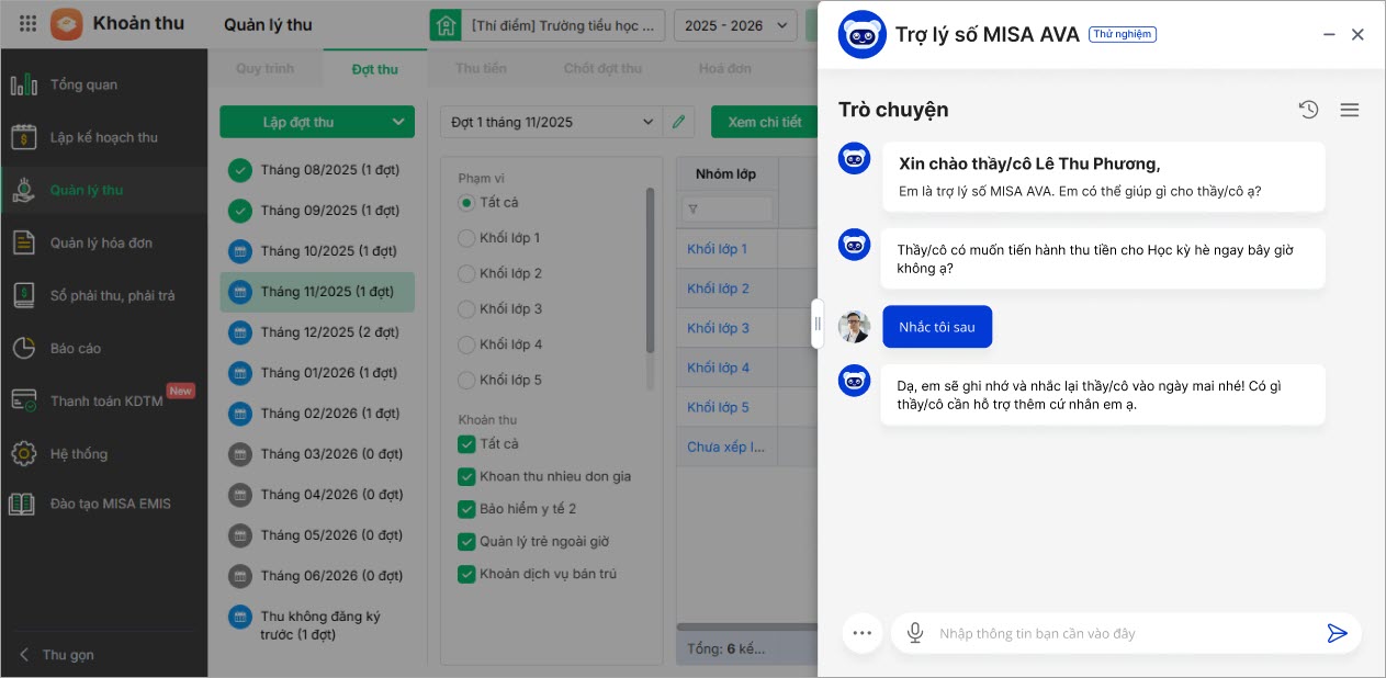 Nếu chọn Nhắc tôi sau, AVA sẽ ghi nhớ và nhắc lại thầy cô lập kế hoạch thu tiền cho học kỳ hè