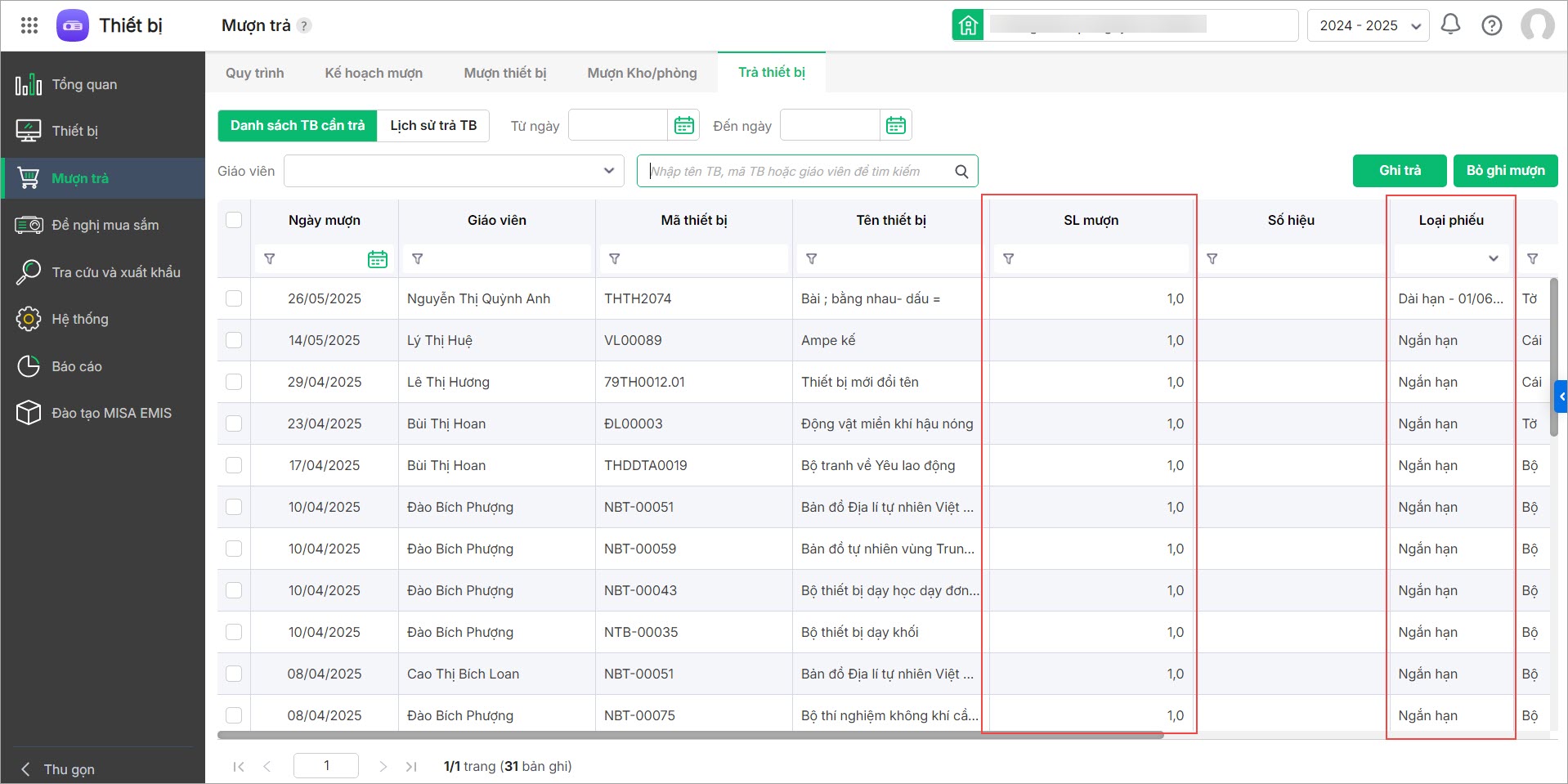 • Với phiếu mượn dài hạn khi được ghi mượn đúng hạn và đã trả, cán bộ thiết bị cần rà soát kỹ lưỡng để ghi trả đúng thiết bị tương ứng.