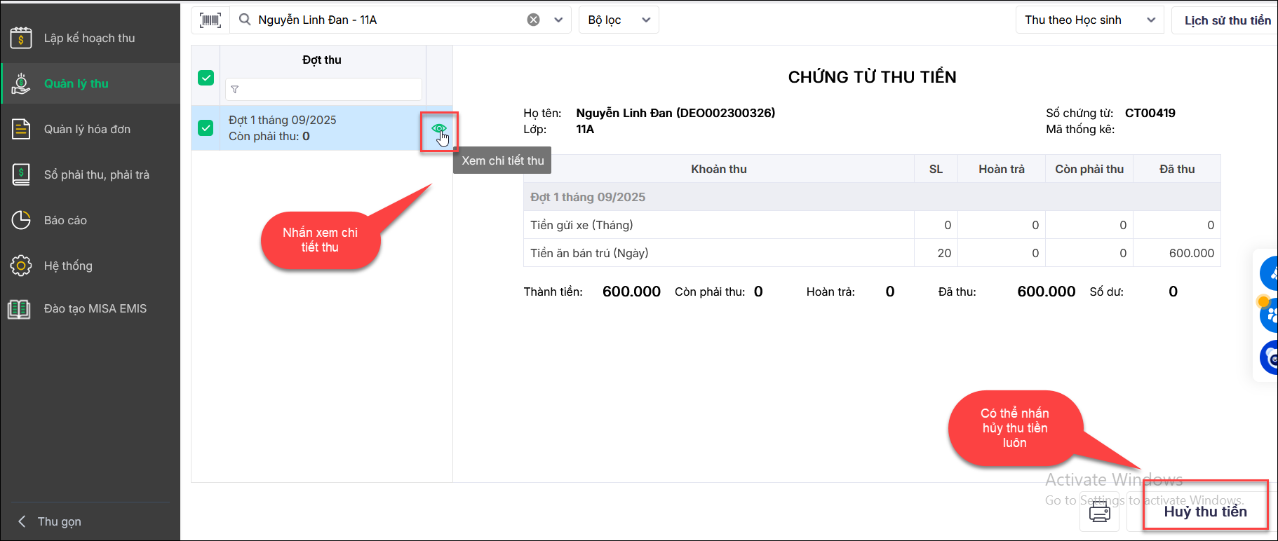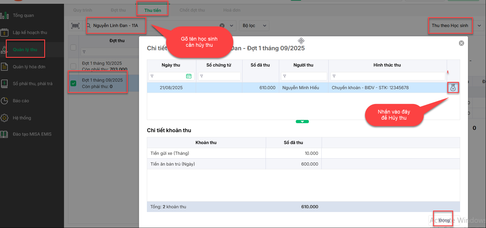 Cách 2: Nếu Hủy thu theo học sinh (nếu mới phát sinh thu một vài học sinh)