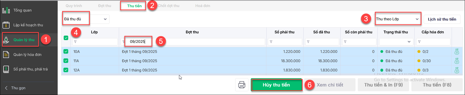 Cách 1: Nếu Hủy thu theo lớp (nếu thu nguyên cả lớp)