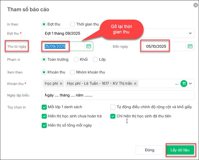 Lưu ý: Khi in báo cáo chọn đúng đợt thu và thời gian thu.