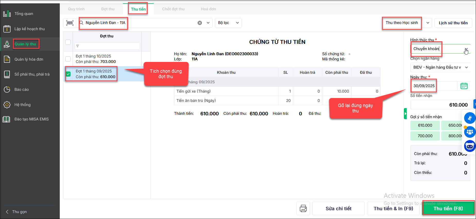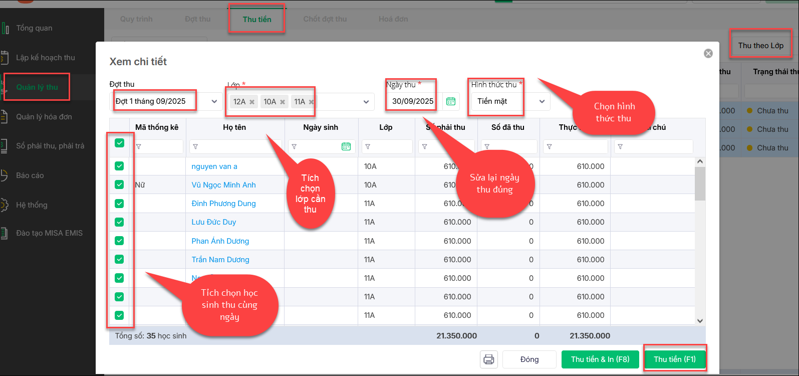 - Thu tiền lại cần chọn đúng ngày thu; đợt thu; hình thức thu, nhấn Thu tiền