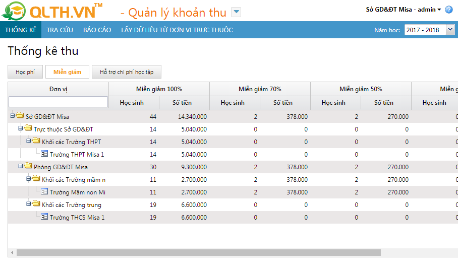 3. Chọn tab Miễn giảm để xem thống kê tình hình miễn giảm của trường THPT và các Phòng trực thuộc.