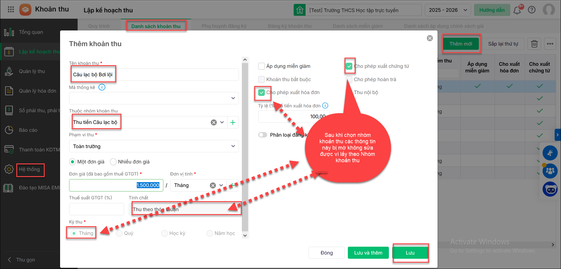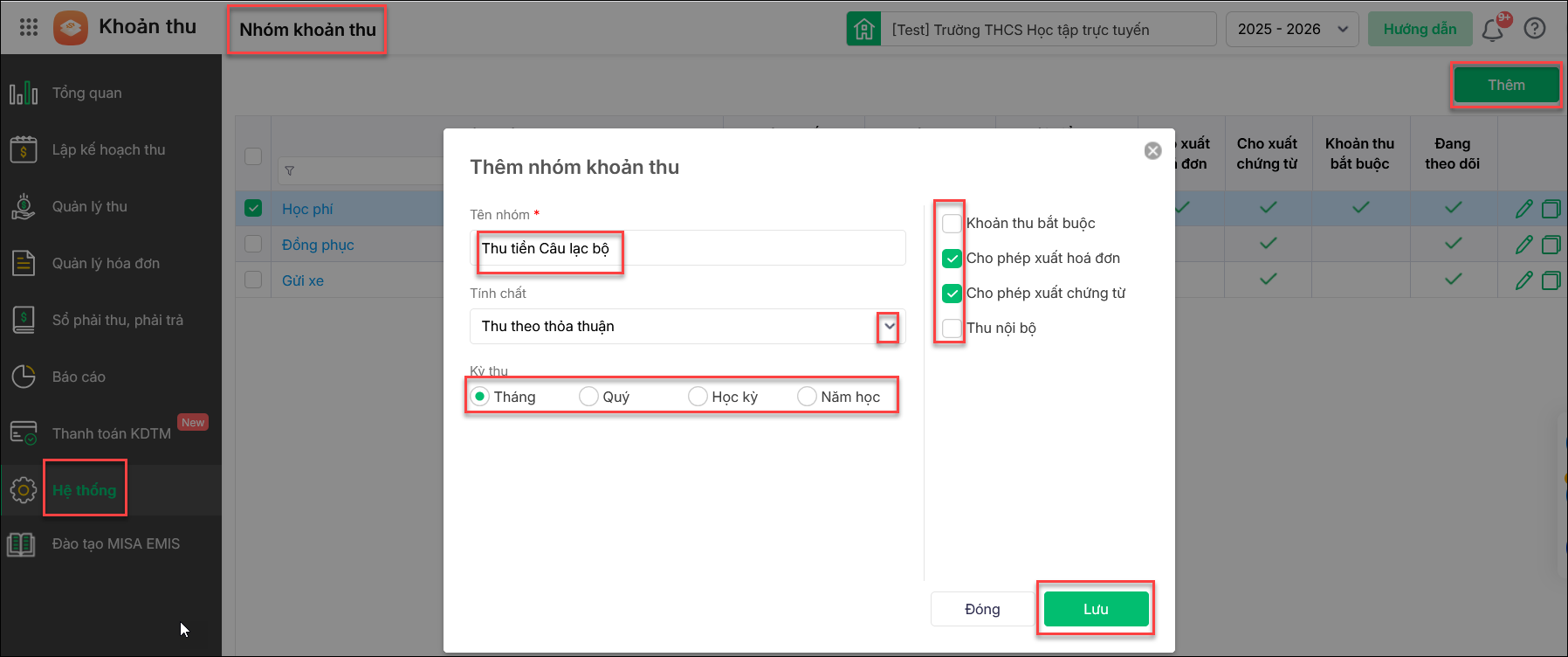 Vào Hệ thống/Nhóm khoản thu: Thêm nhóm khoản thu và khai báo các thông tin liên quan. Nhấn Lưu