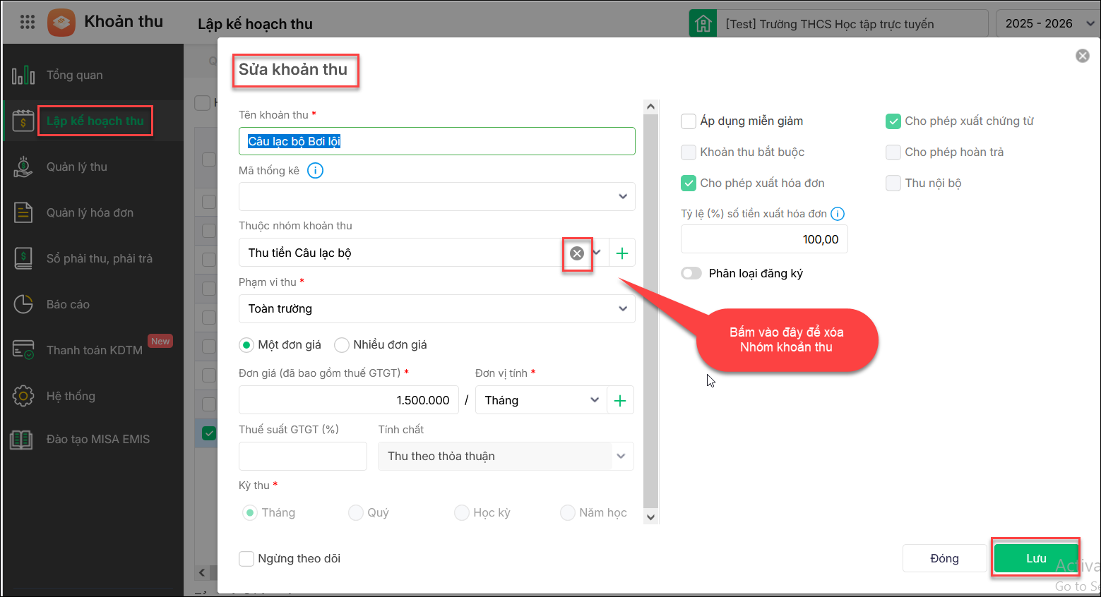 Trường hợp muốn Xóa Nhóm khoản thu trong Khoản thu vào Lập kế hoạch thu\Danh sách khoản thu\Sửa khoản thu và bấm dấu nhân cuối dòng ô Thuộc nhóm khoản thu để xóa bỏ Nhóm khoản thu đã khai báo. Nhấn Lưu.