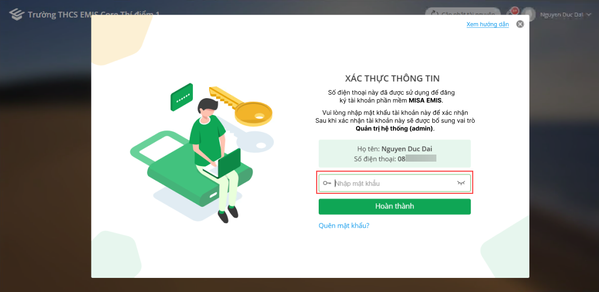 2. Khi anh/chị nhập số điện thoại, phần mềm sẽ kiểm tra xem số này đã được dùng để đăng ký tài khoản trên phần mềm EMIS chưa. Nếu có, anh/chị cần nhập mật khẩu của tài khoản đó để liên kết với tài khoản đang dùng trên hệ thống MISA.