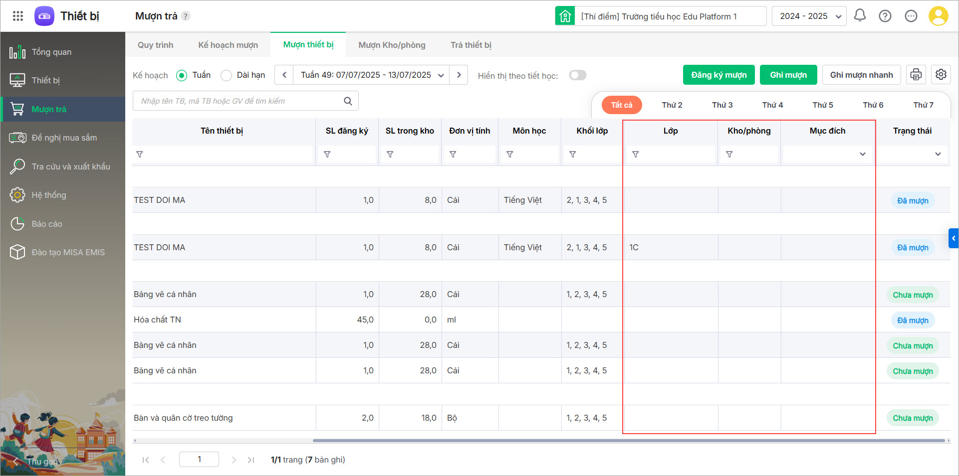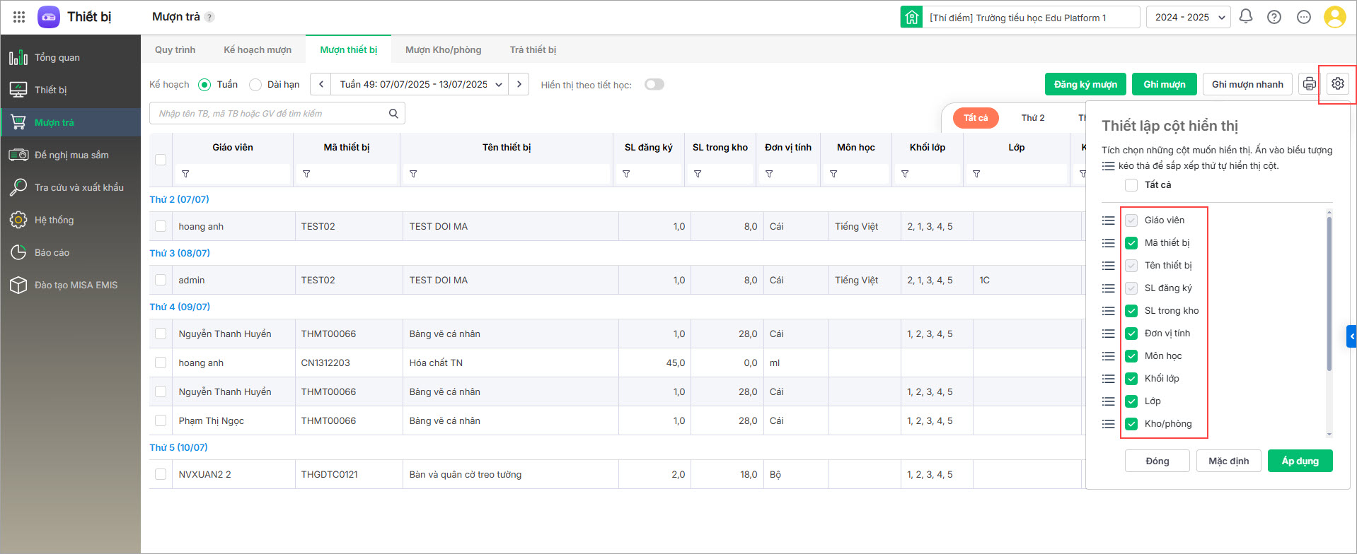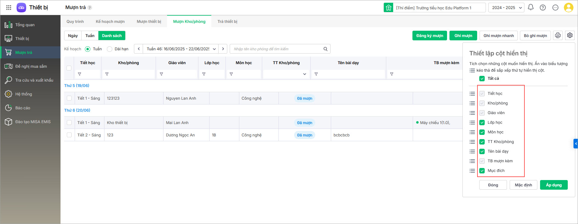 - Tại menu Mượn trả\Mượn thiết bị: Xem danh sách phiếu mượn của giáo viên, không kèm theo lớp và Tên bài dạy.