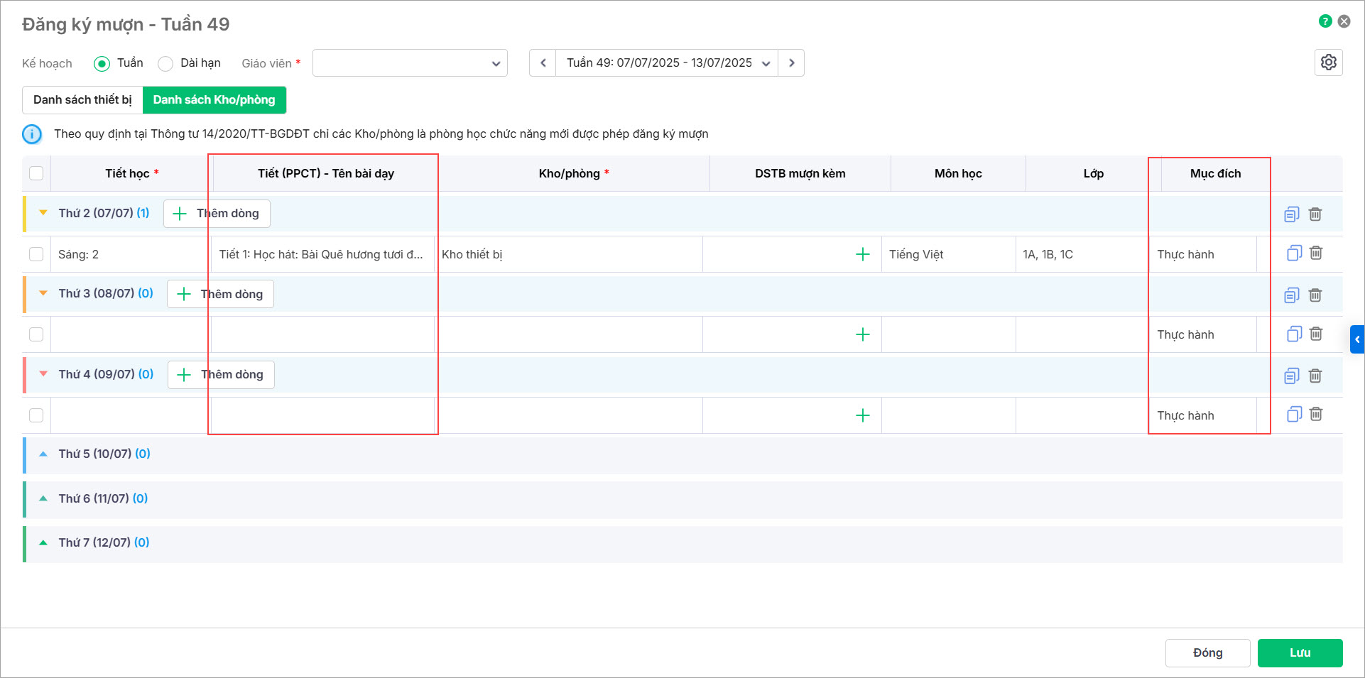 - Tại menu Mượn trả\Kế hoạch mượn: Phần mềm cho phép người dùng xem danh sách phiếu đăng ký mượn của từng giáo viên theo tuần. Khi xem chi tiết, không hiển thị thông tin Tên bài dạy và lớp tương ứng với phiếu đăng ký.