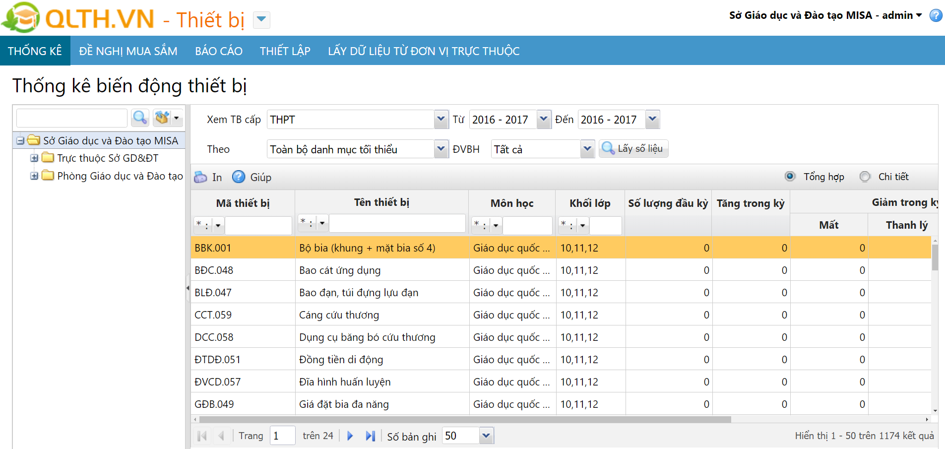 Cho phép Phòng giáo dục, Sở giáo dục xem được thông tin thống kê về tình hình biến động thiết bị giáo dục thuộc danh mục thiết bị tối thiểu (Số lượng thiết bị đầu kỳ, cuối kỳ, tăng, giảm trong kỳ) của các đơn vị trên địa bàn quản lý chi tiết theo từng khối quản lý (trực thuộc Sở Giáo dục, khối các trường