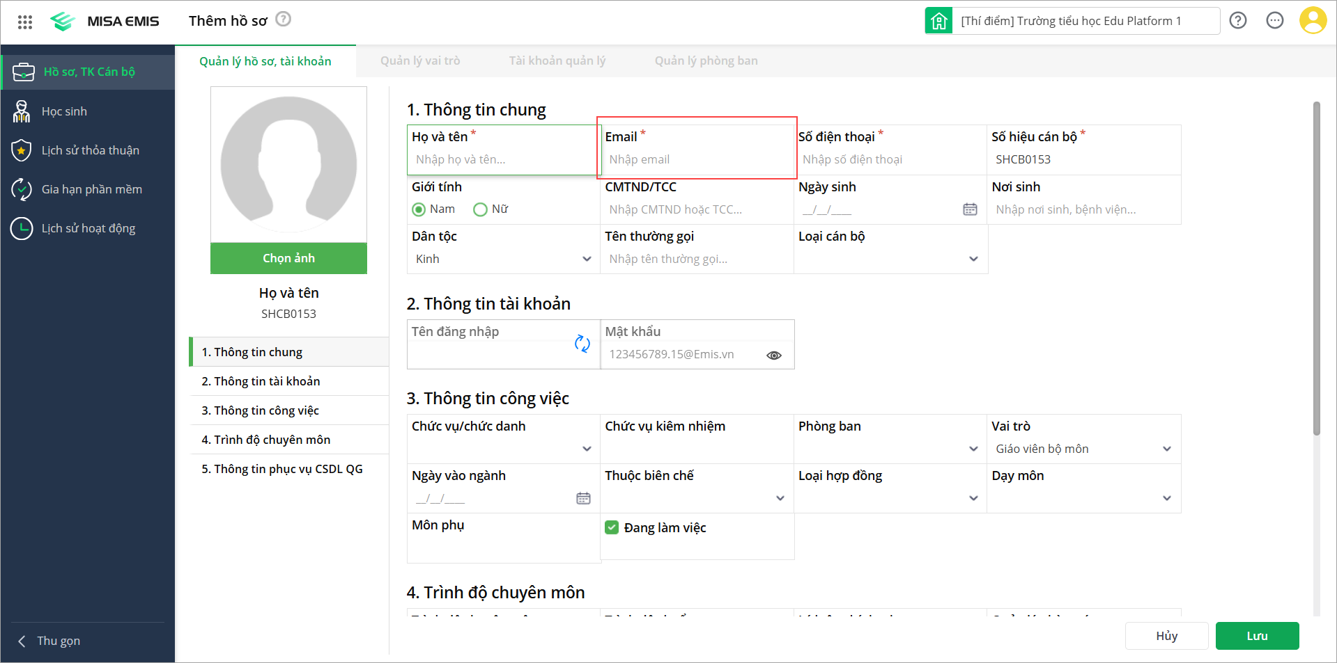 Tại menu Hồ sơ, TK Quản lý cán bộ\Quản lý hồ sơ, tài khoản: Bổ sung trường thông tin Email trong mục Thông tin chung: