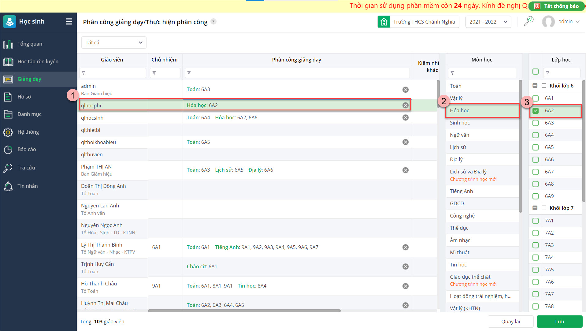 Lưu ý: - Mỗi giáo viên anh/chị có thể phân công giảng dạy nhiều môn và nhiều lớp khác nhau