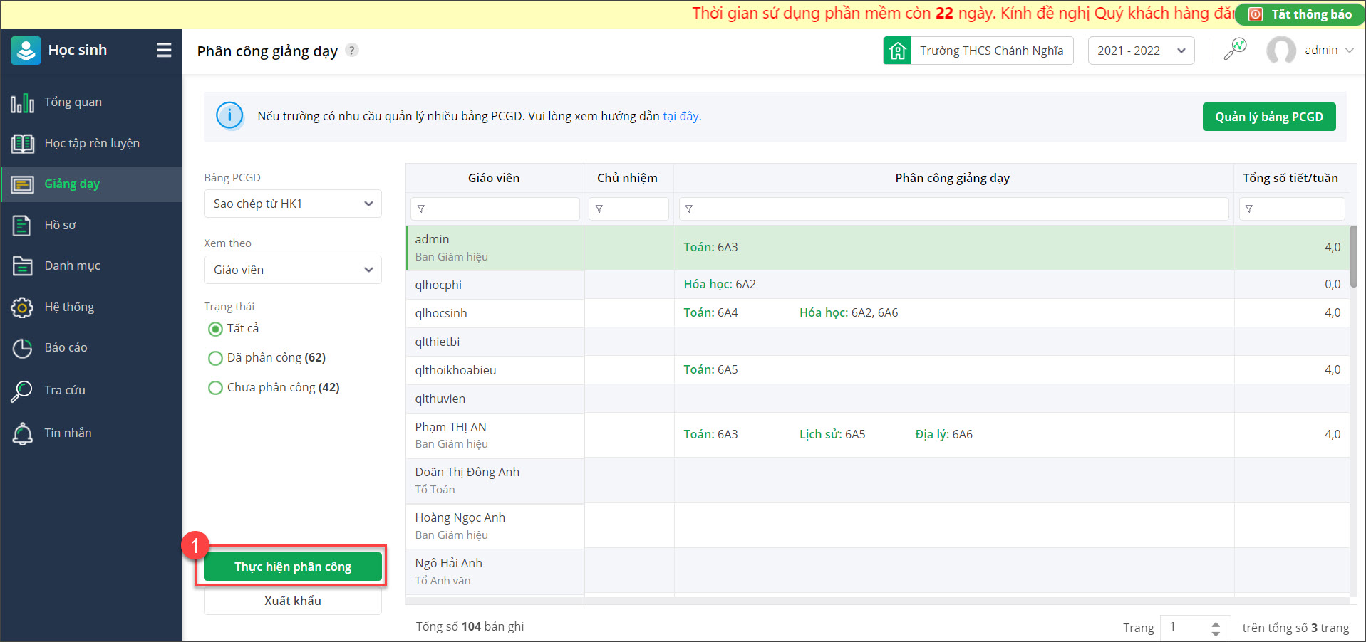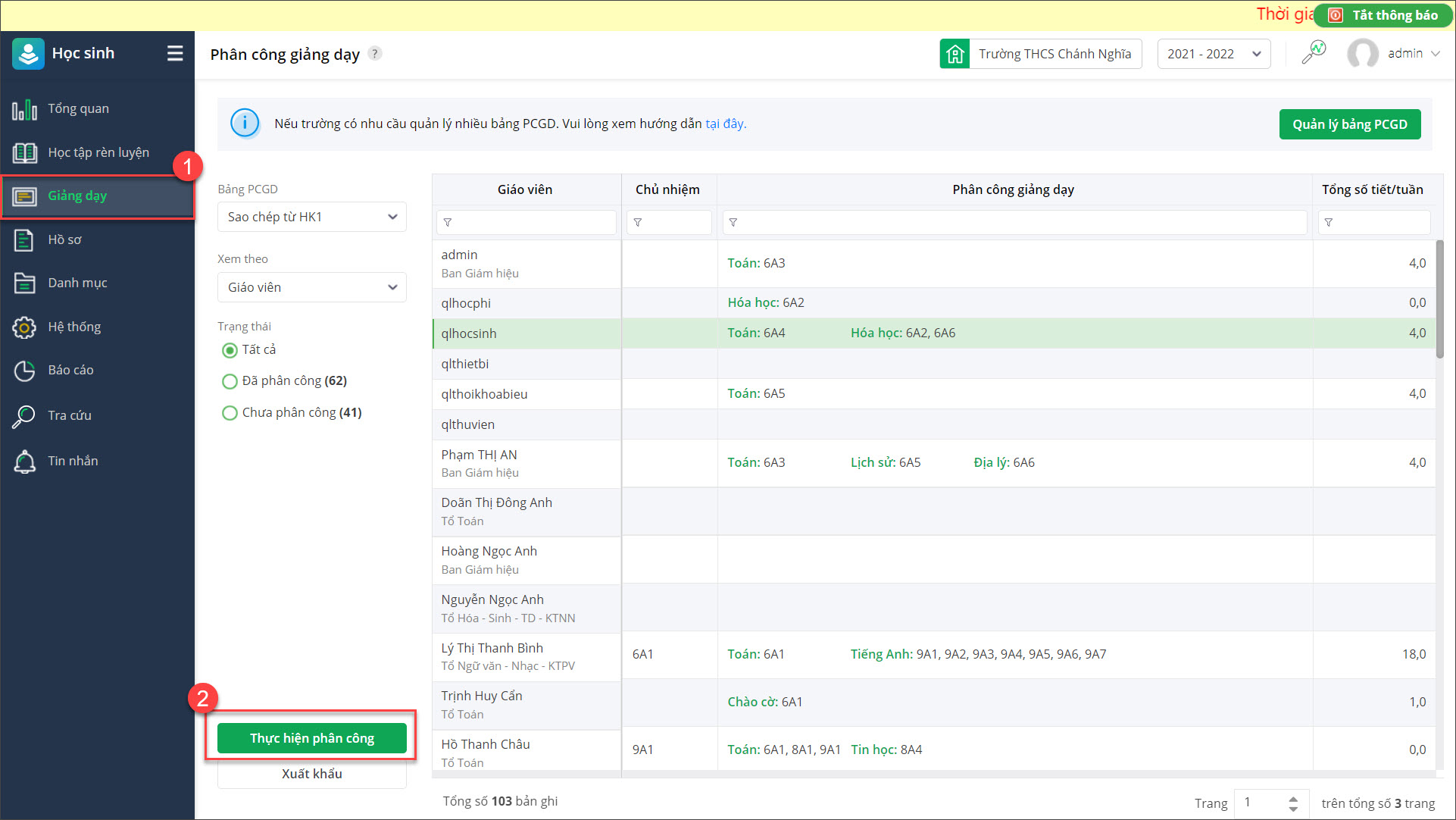 Bước 1: Vào menu Giảng dạy\Phân công giảng dạy. Nhấn Thực hiện phân công.