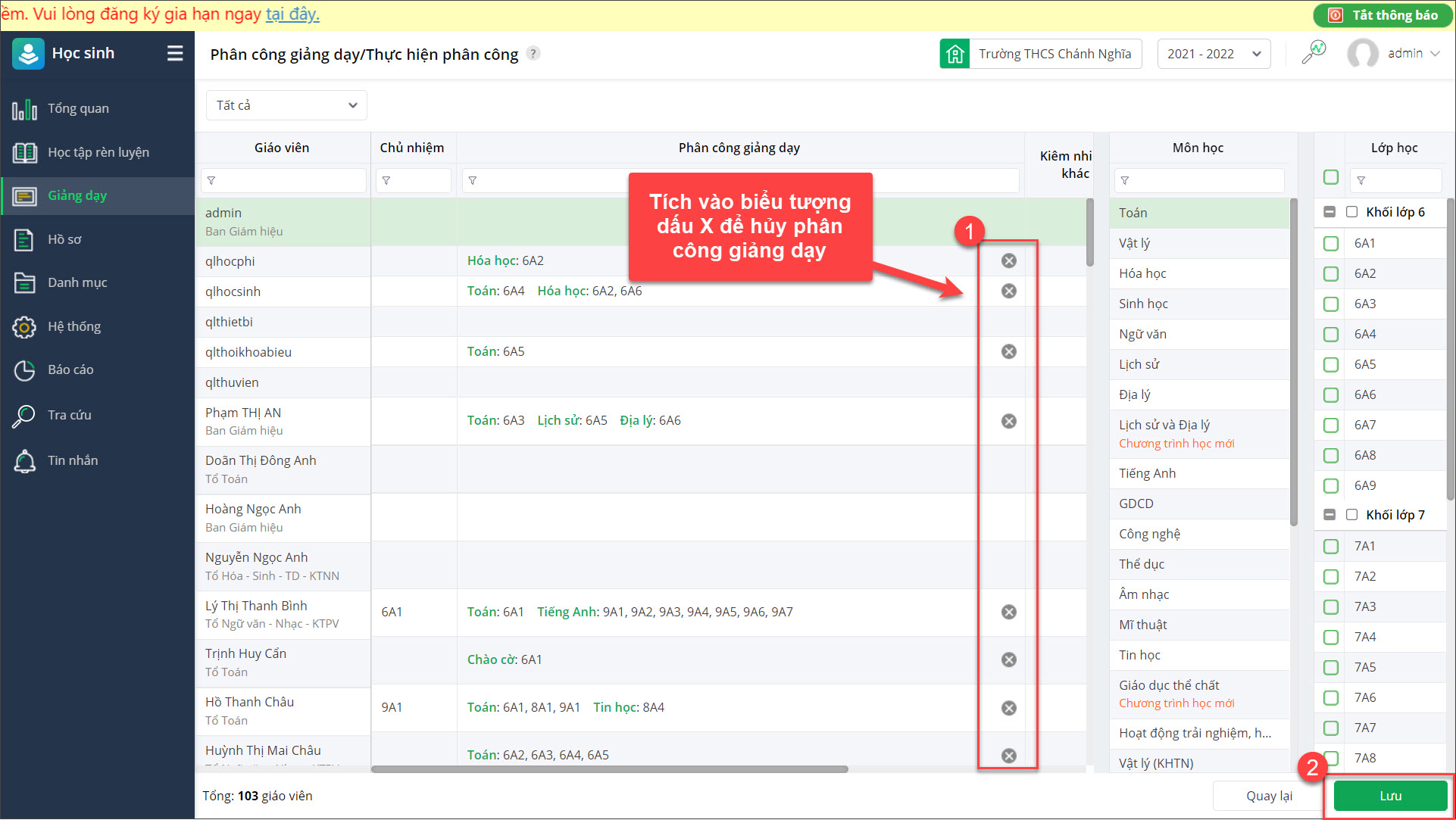 Bước 2: Sau khi nhấn Thực hiện phân công, anh/chị tích chọn vào biểu tượng dấu X để hủy phân công rồi nhấn Lưu.