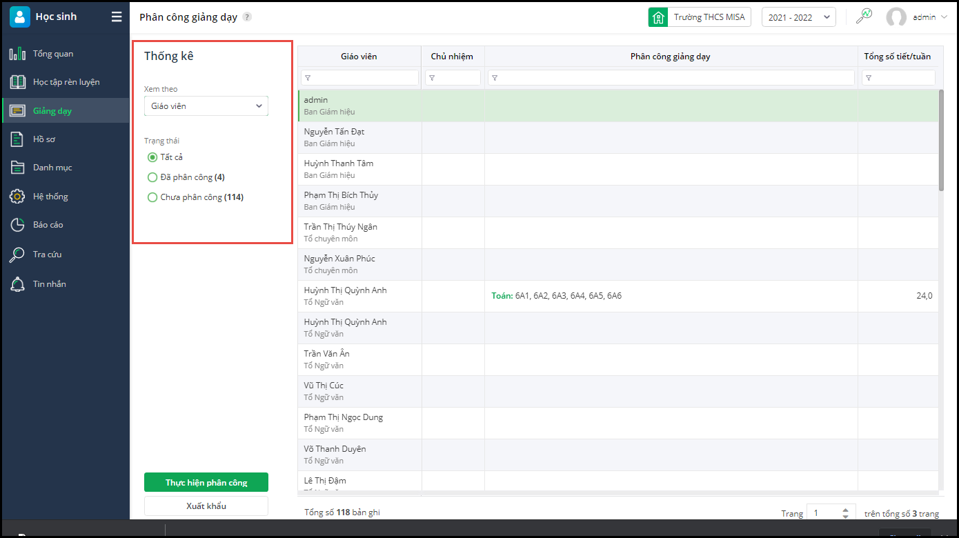 Lưu ý: Hiệu trưởng có thể dễ dàng theo dõi thống kê tình hình phân công giảng dạy theo Lớp, Giáo viên hay môn học