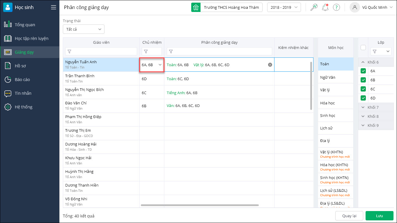 Bước 3: Anh/chị lựa chọn giáo viên muốn phân công, chọn lớp học và môn học được phân công giảng dạy. Sau đó anh chị nhấn Lưu để thực hiện phân công thành công cho giáo viên.