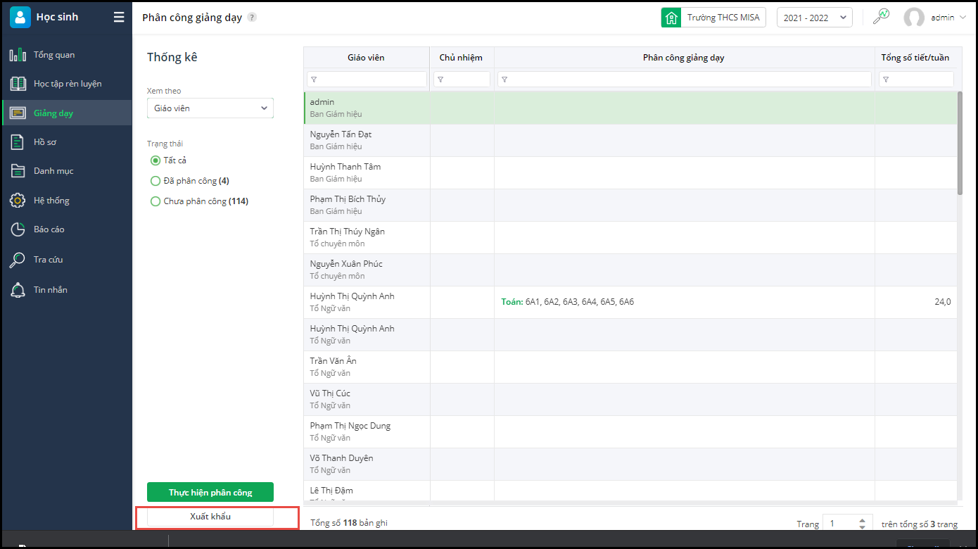 Bước 1: Tại màn hình Phân công giảng dạy, chọn Xuất khẩu để xuất khẩu danh sách đã phân công giảng để lưu trữ hồ sơ.