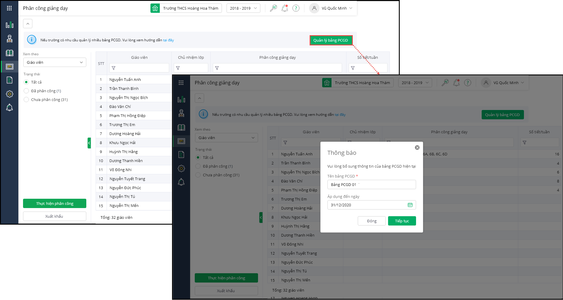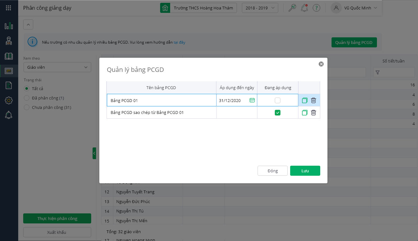 - Trước khi tạo phân công giảng dạy mới, anh/chị cần lưu lại đợt PCGD hiện tại. Nhấn Quản lý bảng PCGD và khai báo Tên bảng PCGD, thời gian Áp dụng đến ngày.