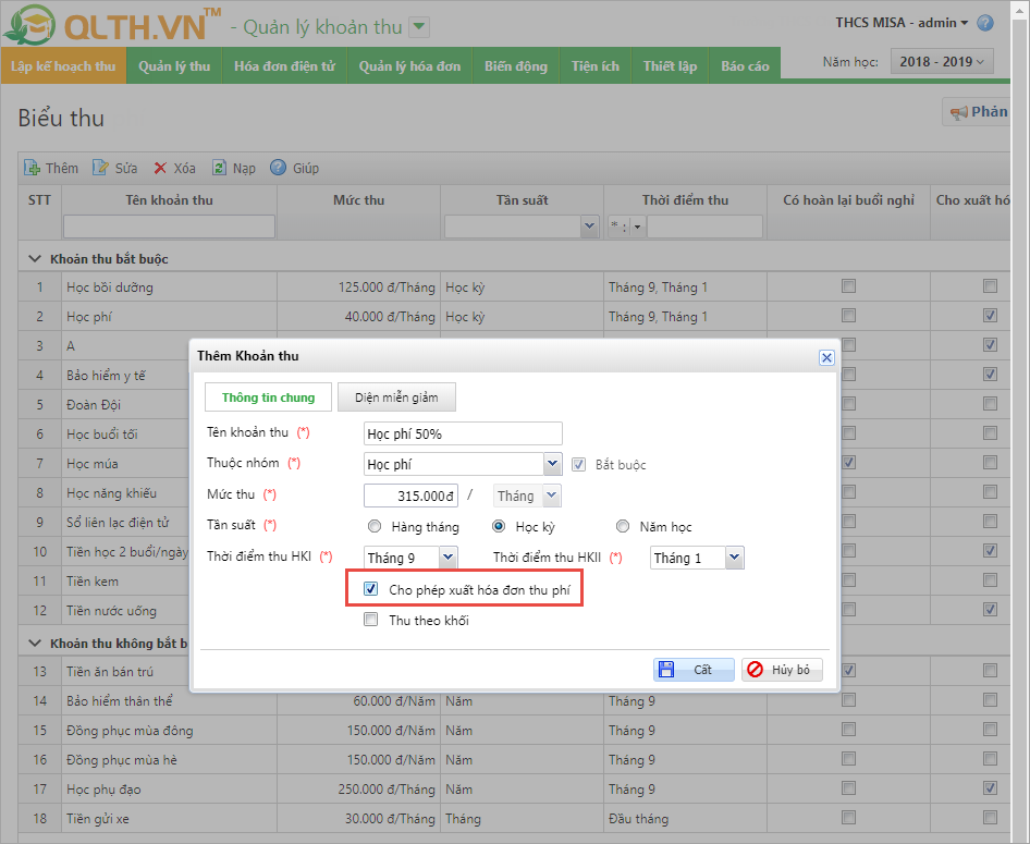 Nguyên nhân: Khi thực hiện cấp hóa đơn thu phí cho đối tượng là học sinh được miễn giảm 50% thì cần phải tích chọn thông tin Cho phép xuất hóa đơn thu phí trên khoản thu đã thiết lập thì mới có thể thực hiện in được hóa đơn.