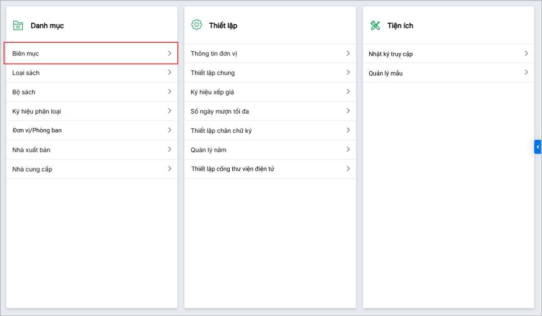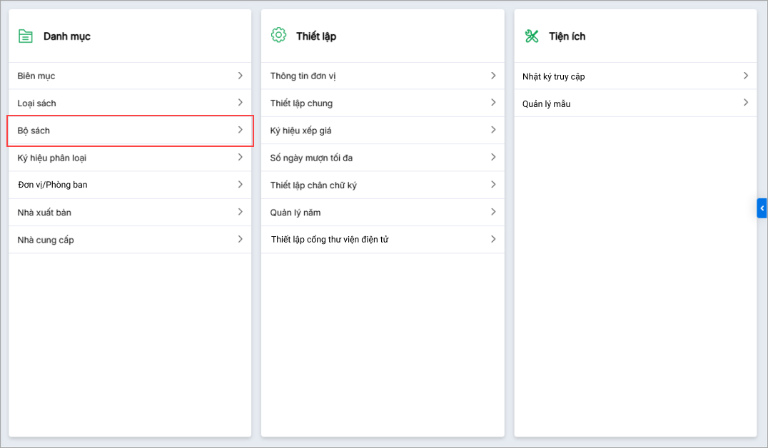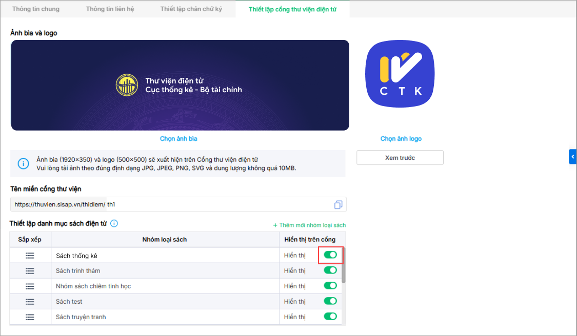 - Tại Thiết lập danh mục sách điện tử: