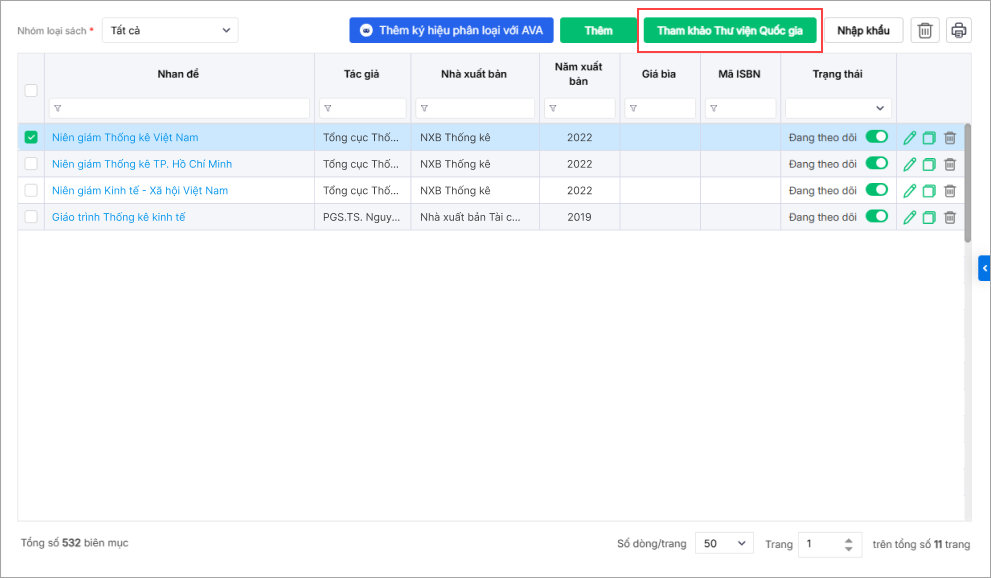 - Cán bộ thư viện có thể tham khảo biên mục sách từ Thư viện Quốc gia Việt Nam và thêm mới trực tiếp vào phần mềm bằng cách chọn Tham khảo Thư viện Quốc gia.
